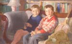 Portrait: 1928. Height approximately twice the width. Painted in Marblehead, MA. The father is in business suit; left hand holding cigarette, right hand behind son. Son, hands crossed, leans against table. Papers and rolled up sheets (plans, presumably) at lower right.